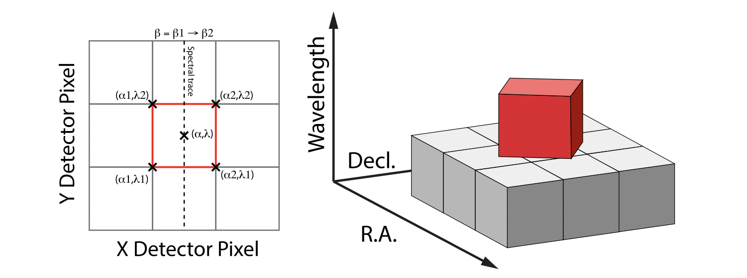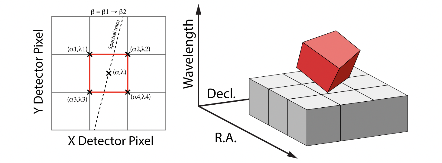 With these simplifications, detector pixels project as rectilinear volumes into cube space. The detector pixel flux is redistributed onto a regular output grid according to the relative overlap between the detector pixels and cube voxels. The weighting applied to the detector pixel flux is the product of the fractional spatial and spectral overlap between detector pixels and cube voxels as a function of wavelength. The spatial extent of each detector pixel volume is determined from the combination of the along-slice pixel size and the IFU slice width, both of which will be rotated at some angle with respect to the output voxel grid of the final data cube. The spectral extent of each detector pixel volume is determined by the wavelength range across the pixel in the dimension most closely matched to the dispersion axis (i.e., neglecting small tilts of the dispersion direction with respect to the detector pixel grid). For more details on this method, see A 3D Drizzle Algorithm for JWST and Practical Application to the MIRI Medium Resolution Spectrometer, Law, D. R., et al. 2023, AJ, 166, 45.