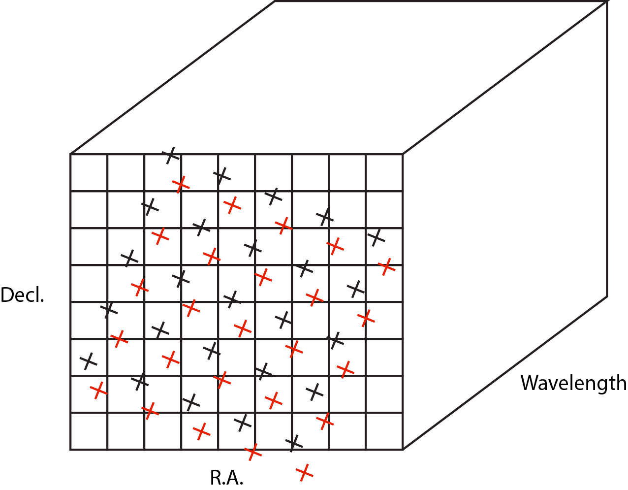 Each point in the cloud represents a measurement of the specific intensity (with corresponding uncertainty) of the astronomical scene at a particular location. The final data cube is constructed by combining each of the irregularly-distributed samples of the scene into a regularly-sampled voxel grid in three dimensions for which each spaxel (i.e., a spatial pixel in the cube) has a spectrum composed of many spectral elements. The final value of value of a given voxel of the cube is a distance-weighted average of all point-cloud members within a given region of influence.